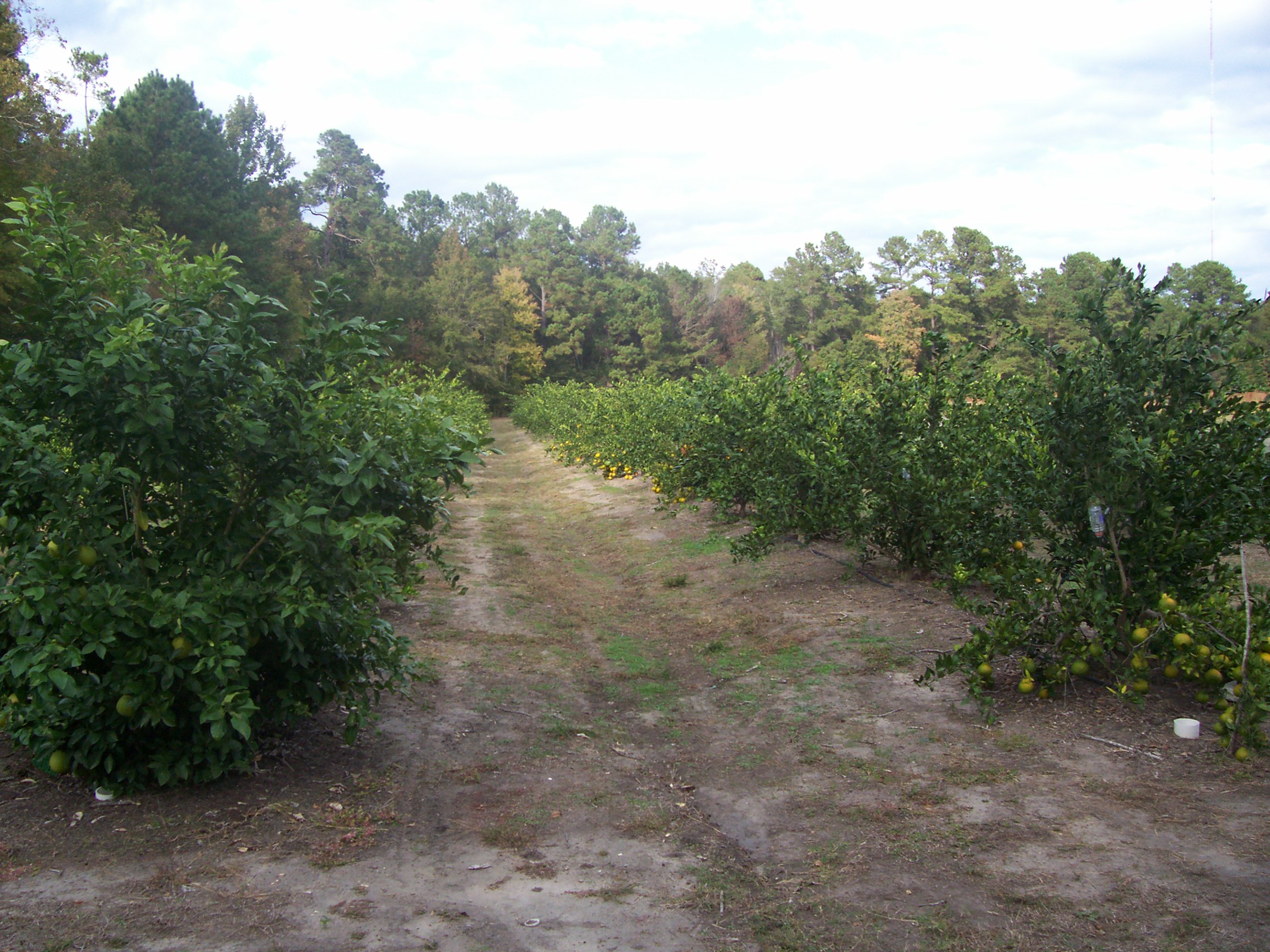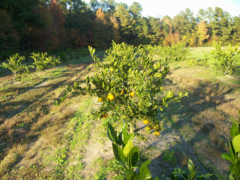 Satsuma grove at McKenzie Farms, October 2008. Tree with fruit is LA Early Satsuma.
