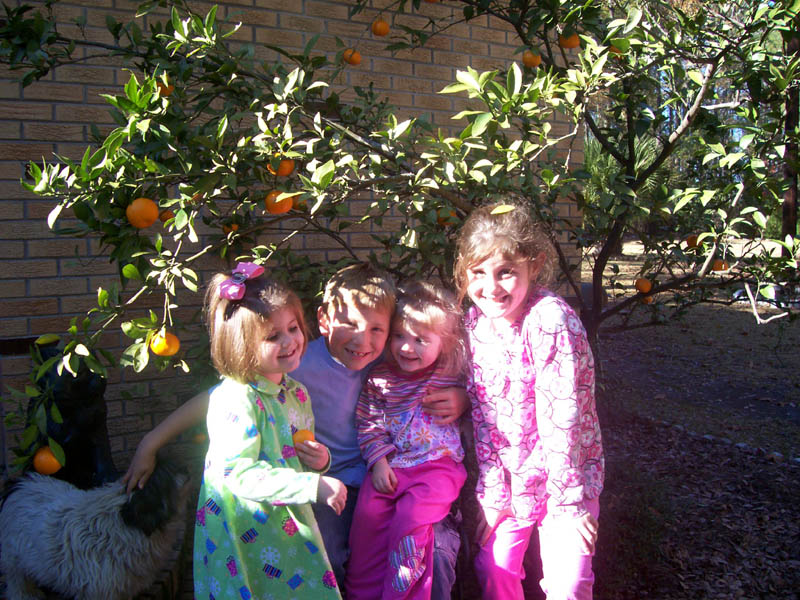 The McKenzie Grandchildren, Marietta Floyd, McKenzie Amos, Ruby Kate Amos and Rhamey Floyd enjoy a sunny afternoon at "Pop Pop" house... The little angels had only moments before been engaged in a tangerine throwing fight!